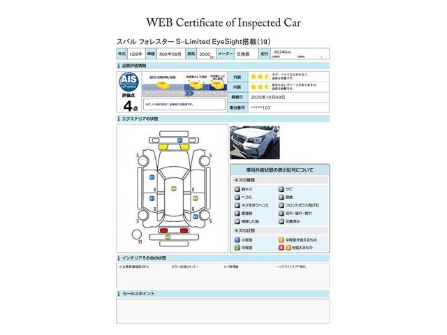 スバル認定U−CARには見やすい評価書がついています。株式会社AISという、車両検査を生業としている専門業者に見てもらい、修復歴、傷、凹み、修理跡、交換跡など1台1台しっかりチェックしてあります。