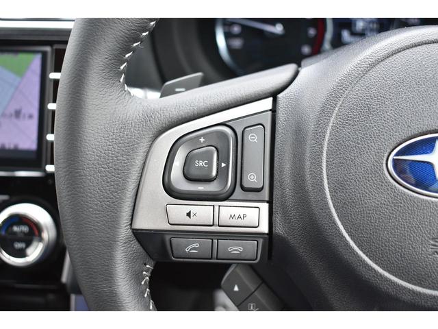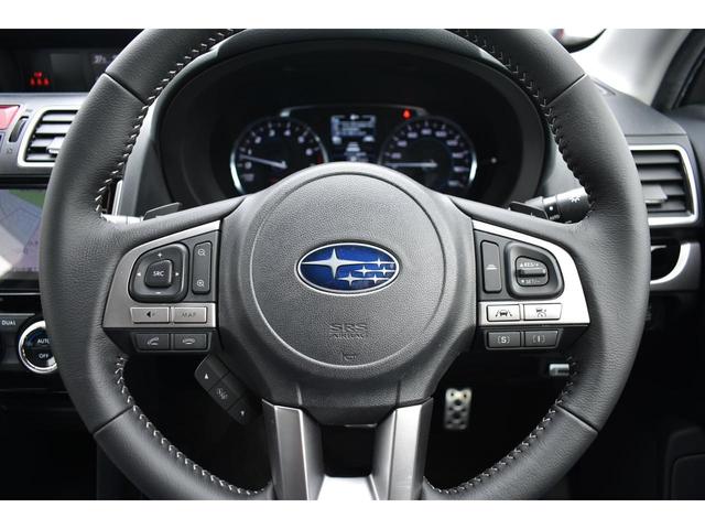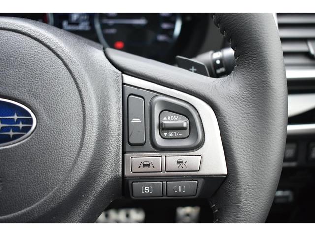 左:ステアリングオーディオコントロールスイッチ。オーディオの操作がお手元で可能です。右:全車速クルーズコントロールの操作スイッチで、アイサイトと連動し前方車両に追従走行できます。