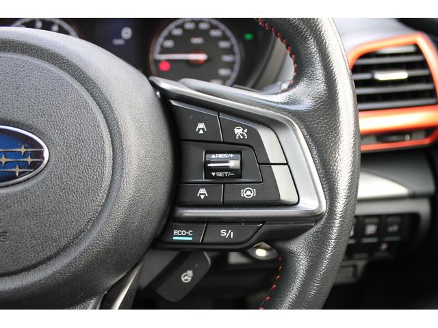 ステアリングスポーク右側には「追従クルーズコントロールスイッチ」、スバルのシステムは停止から高速域まで前車を追従できます、高速巡行だけでなく渋滞時も使えて便利です、レーンキープ機能も付いています