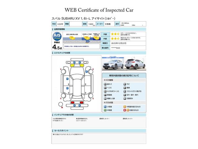 第三者機関による車両検査証、ご検討の際の参考にしてください※すべての傷・凹みなどの記載を保証するものではありません、内外装の状態が気になるかたは実車での確認がおすすめです