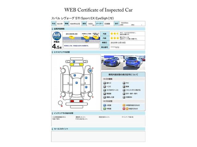 スバル認定U−CARには見やすい評価書がついています。株式会社AISという、車両検査を生業としている専門業者に見てもらい、修復歴、傷、凹み、修理跡、交換跡など1台1台しっかりチェックしてあります。