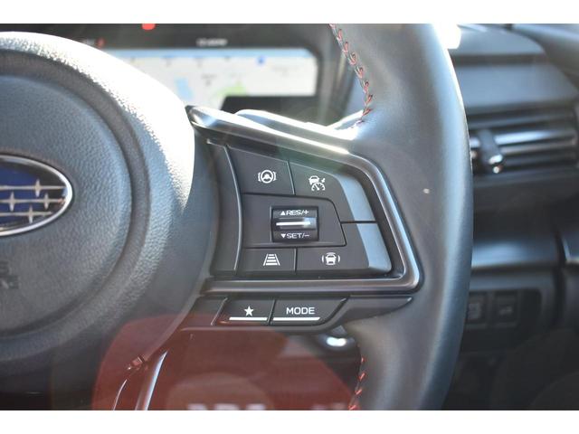 左:ステアリングオーディオコントロールスイッチ。オーディオの操作がお手元で可能です。右:全車速クルーズコントロールの操作スイッチで、アイサイトと連動し前方車両に追従走行できます。