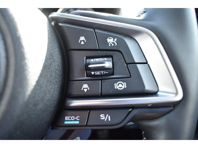 左:ステアリングオーディオコントロールスイッチ。オーディオの操作がお手元で可能です。右:全車速クルーズコントロールの操作スイッチで、アイサイトと連動し前方車両に追従走行できます。