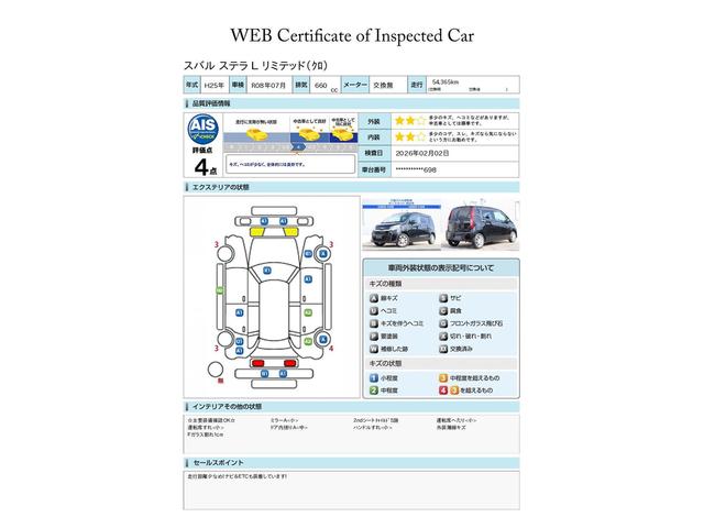 SUBARU認定中古車は第三者機関のAISによる公平な車両検査証も発行されています、ご検討の際の参考にしてください※中古車のため、内外装の細かい状態が気になるかたは実車での確認がおすすめです