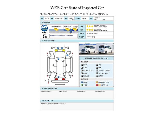 SUBARU認定中古車は第三者機関のAISによる公平な車両検査証も発行されています、ご検討の際の参考にしてください※中古車のため、内外装の細かい状態が気になるかたは実車での確認がおすすめです