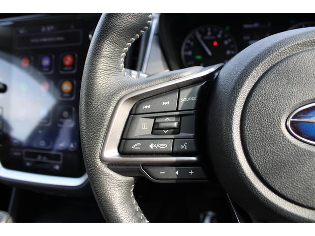 ステアリングスポーク右側には「追従クルーズコントロール」スイッチ、スバルのシステムは停止から高速域まで前車を追従できます、高速巡行だけでなく渋滞時も使えて便利です、レーンキープ機能も付いています