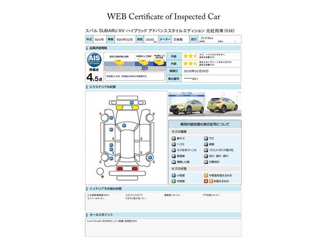 SUBARU認定中古車は第三者機関のAISによる公平な車両検査証も発行されています、ご検討の際の参考にしてください※中古車のため、内外装の細かい状態が気になるかたは実車での確認がおすすめです