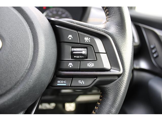 ステアリングスポーク右側に「全車速追従クルーズコントロール」のスイッチがあります、スバルのシステムは停止から高速域まで前車を追従できます、高速巡行だけでなく渋滞時も使えて便利、レーンキープ機能付き