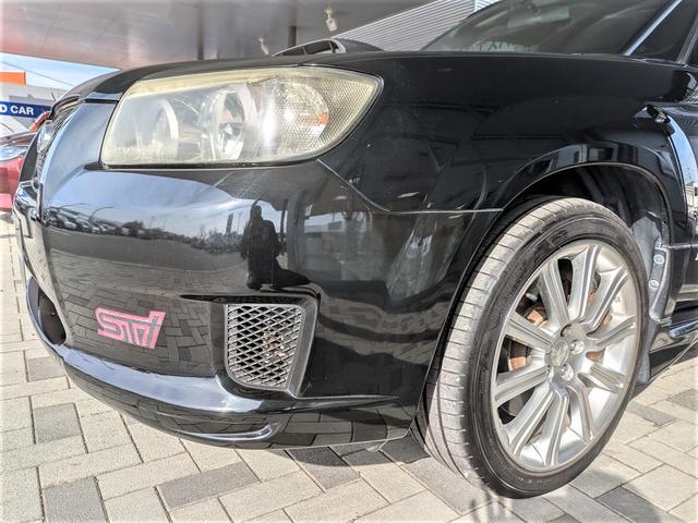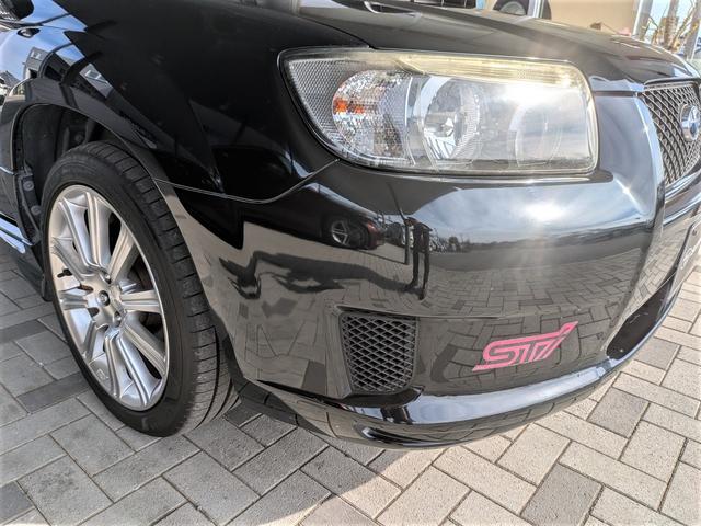 STIのステッカーは経年劣化によるひび割れと色褪せがございます。また、左側のヘッドライトはSG後期特有の浸水の跡が見受けられ、ヘッドライトの劣化が見えます。