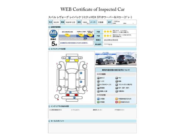 SUBARU認定中古車は第三者機関のAISによる公平な車両検査証も発行されています、ご検討の際の参考にしてください※中古車のため、内外装の細かい状態が気になるかたは実車での確認がおすすめです