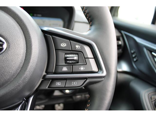 ステアリングスポーク右側には「追従クルーズコントロール」のスイッチ、スバルのシステムは停止から高速域まで前車を追従できます、高速巡行だけでなく渋滞時も使えて便利ですレーンキープ機能も付いています