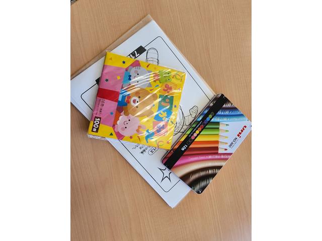 お子様連れのお客様に安心して商談してただけるよう塗り絵や折り紙の用意がございます!