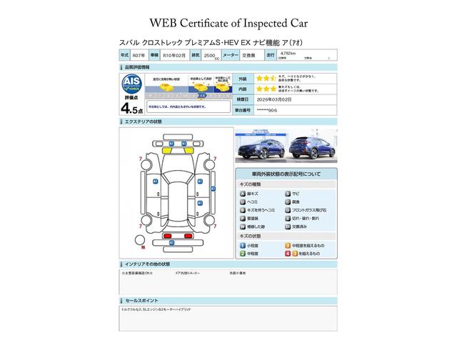 SUBARU認定中古車は第三者機関のAISによる公平な車両検査証も発行されています、ご検討の際の参考にしてください※中古車のため、内外装の細かい状態が気になるかたは実車での確認がおすすめです