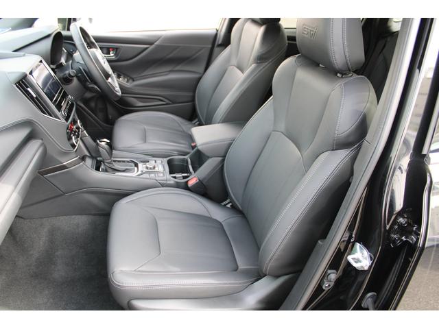 運転席シートの写真、STIブラックインテリア専用ブラックの本革シートです、ヘッドレスト部にエンボス加工で「STI」ロゴもあしらっています、身体にフィットする形状でロングドライブでも疲れにくいと思います