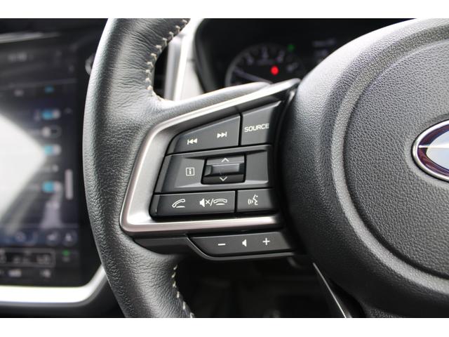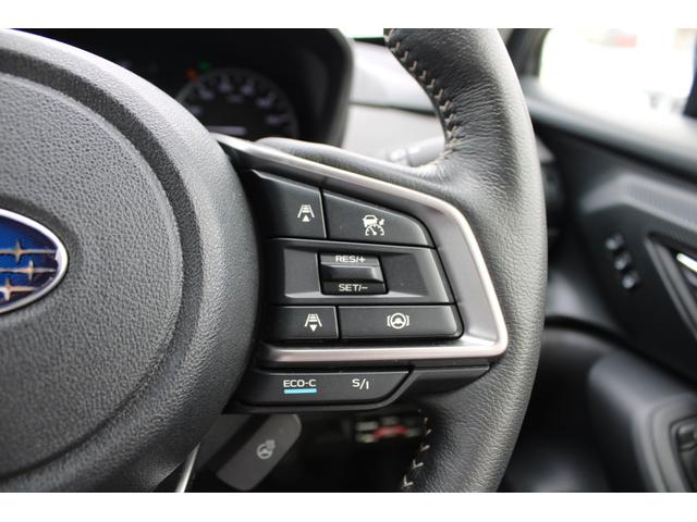 ステアリングスポーク右側には「追従クルーズコントロール」スイッチ、スバルのシステムは停止から高速域まで前車を追従できます、高速巡行だけでなく渋滞時も使えて便利です、レーンキープ機能も付いています