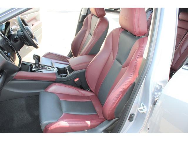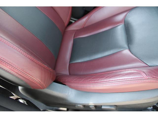 運転席シートの写真、スポーティで高級感もあるSTIスポーツ専用のボルドー&ブラックの本革シートです、ヘッドレスト部にはSTIのロゴがエンボス加工されています