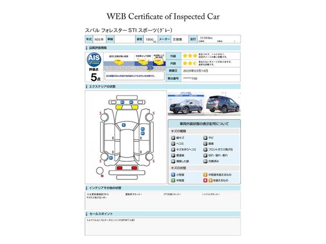 SUBARU認定中古車は第三者機関のAISによる公平な車両検査証も発行されています、ご検討の際の参考にしてください※中古車のため、内外装の細かい状態が気になるかたは実車での確認がおすすめです