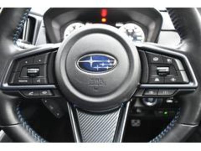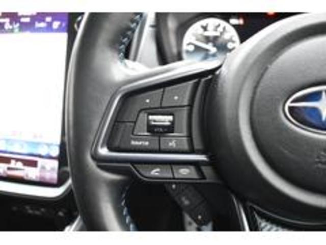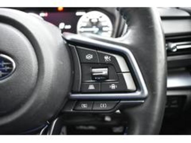 左:ステアリングオーディオコントロールスイッチ。オーディオの操作がお手元で可能です。右:全車速クルーズコントロールの操作スイッチで、アイサイトと連動し前方車両に追従走行できます。