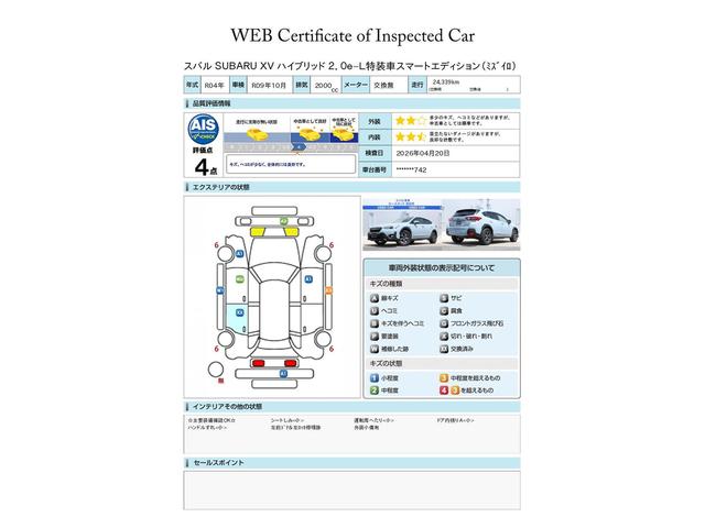 SUBARU認定中古車は第三者機関のAISによる公平な車両検査証も発行されています、ご検討の際の参考にしてください※中古車のため、内外装の細かい状態が気になるかたは実車での確認がおすすめです